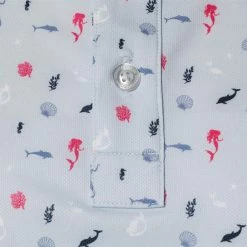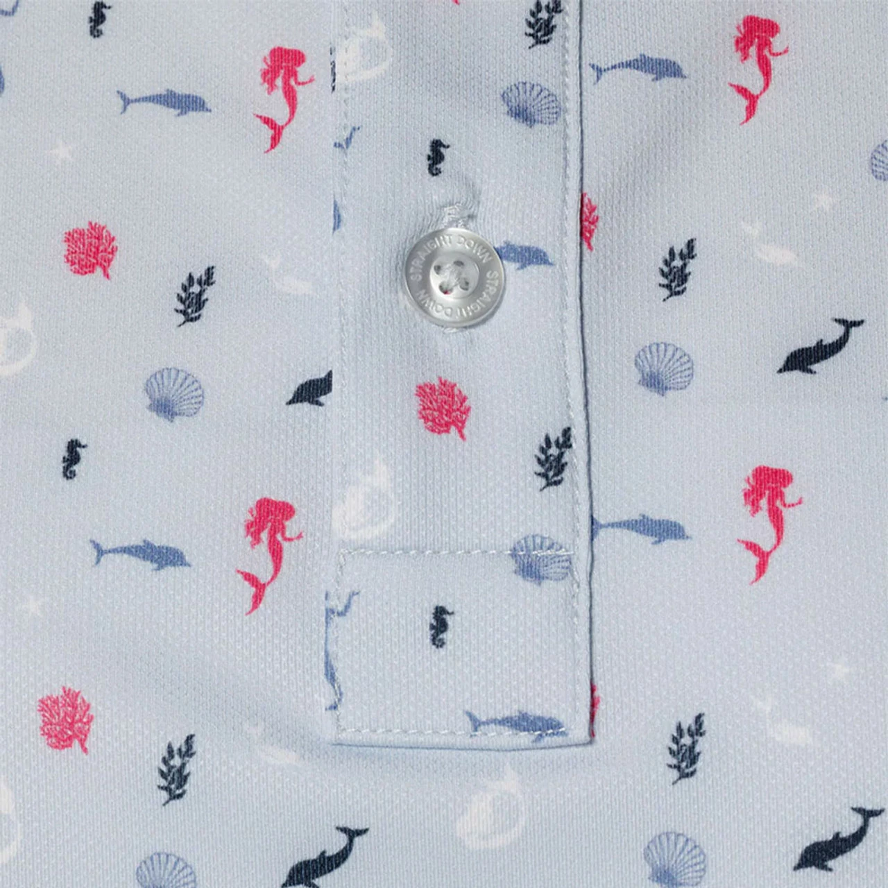 Hear the siren’s call! The Lorelei Polo is covered in a fun mermaid, siren and sea life print. Made from soft performance-ready micro-pique fabric. Stay flat collars, moisture and sweat wicking material, and 4-way stretch combine to make this Straight Down golf polo excel on the golf course.
